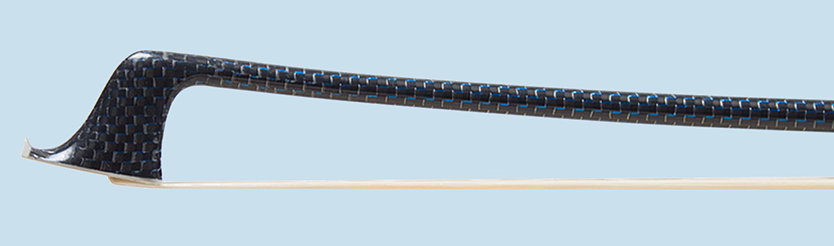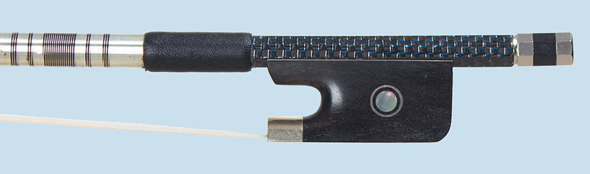 3/4 Carbon fibre cello bow for sale, with a round stick and a carbon weave covering, nickel mounted ebony frog with Parisian-Eye inlay and ebony adjuster with two nickel bands.