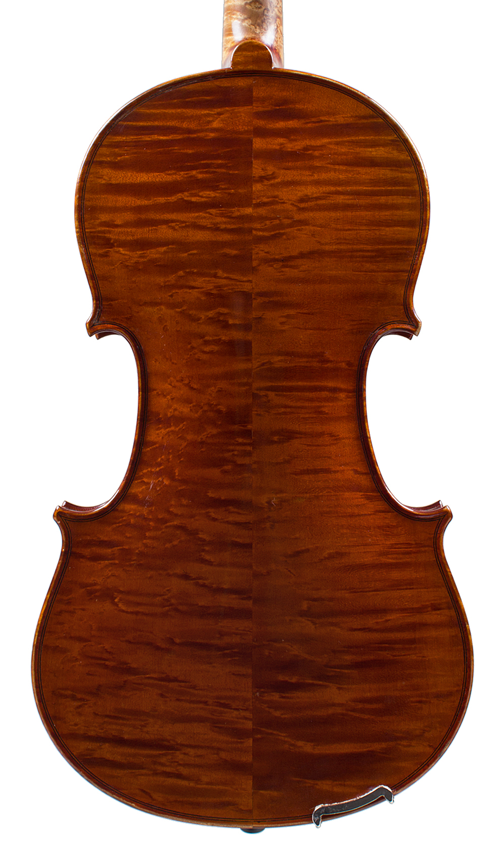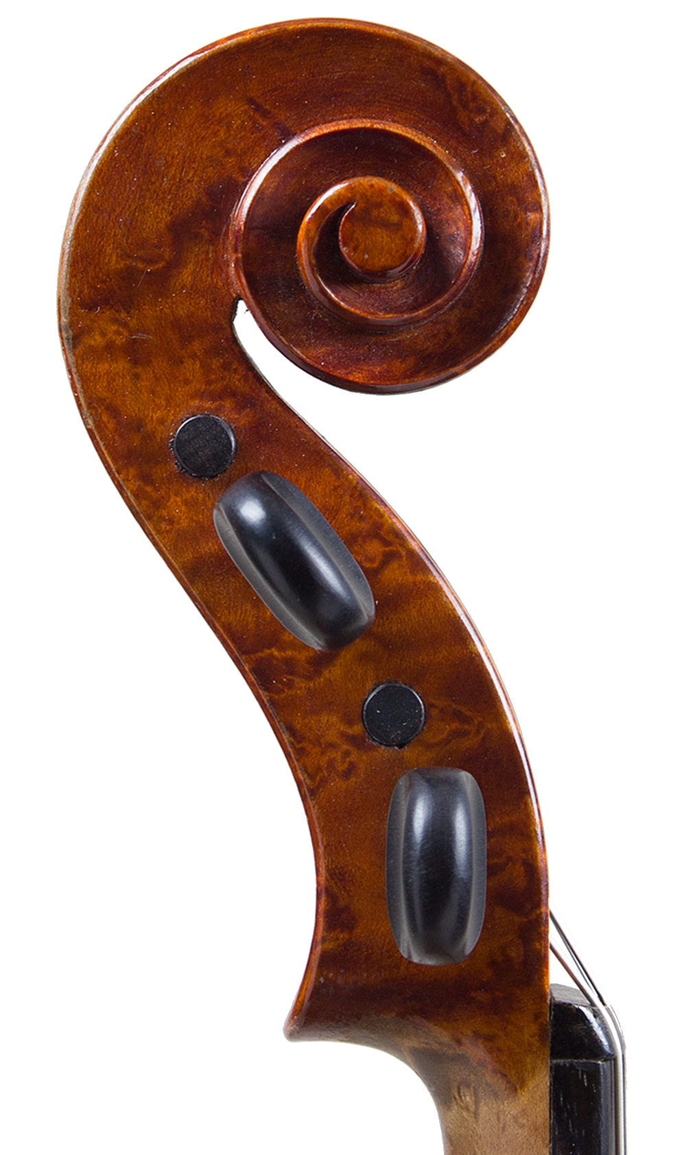The viola back, length 410mm, is in two pieces of quarter-sawn maple with an irregular curl; the ribs, scroll and neck of similar wood. The front is of fine grain spruce and the varnish of a dark red-brown colour.