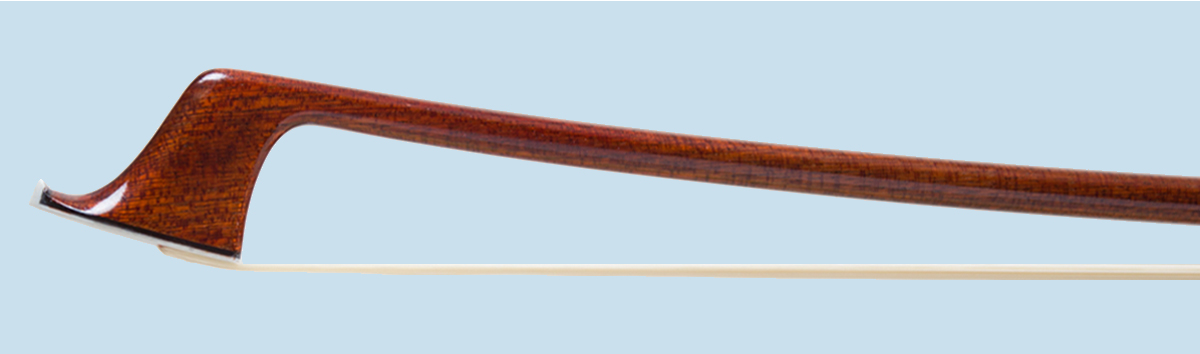 Carbon fibre cello bow for sale, with a round stick and a fine wood veneer covering, nickel mounted ebony frog with pearl eye inlay and nickel overlaid adjuster.