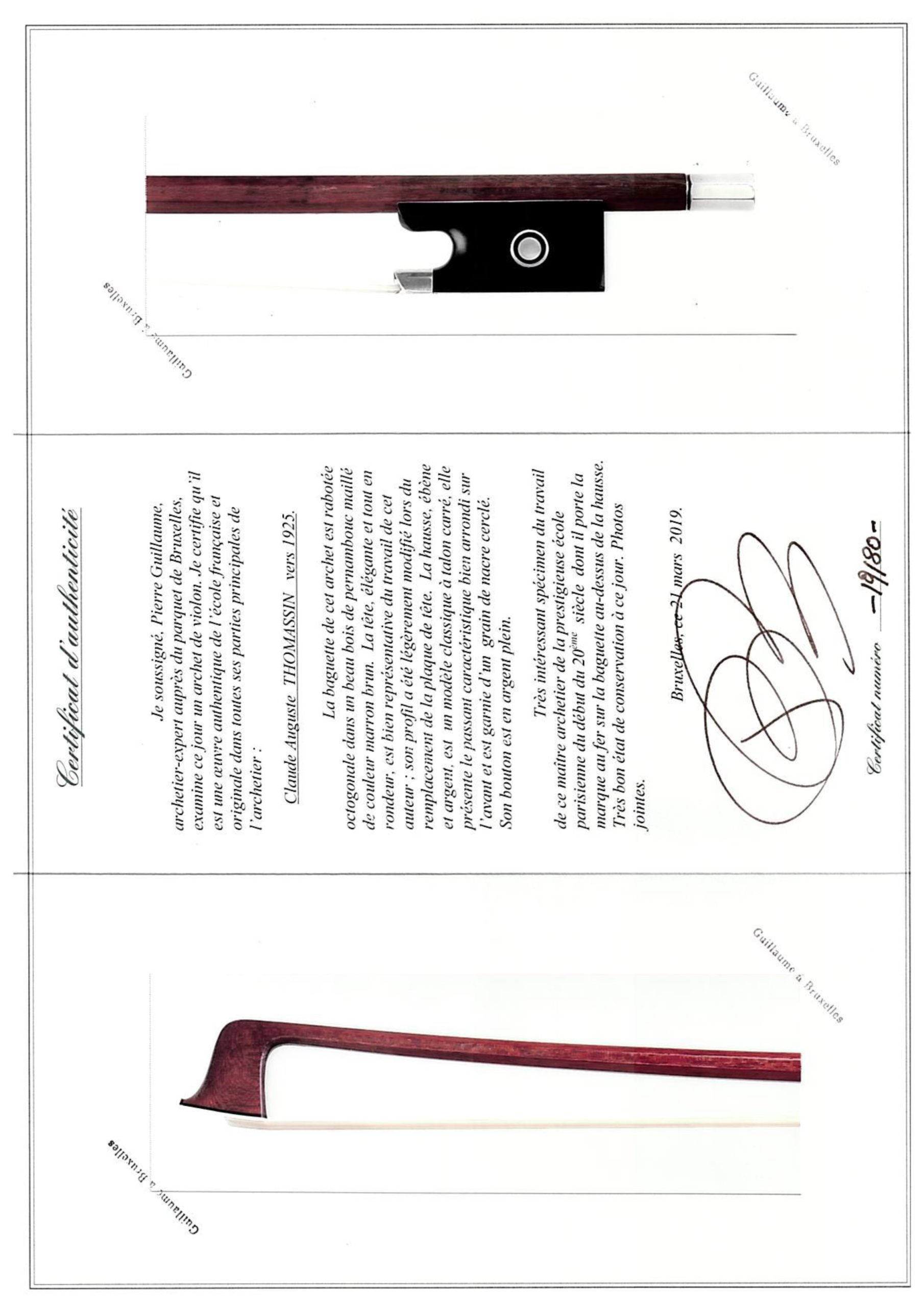 A Claude Thomassin violin bow for sale. A chestnut brown octagonal pernambuco stick, silver mounted ebony frog with Parisian-Eye inlay and silver overlaid adjuster. A fine quality french bow in a good state of preservation and an excellent all round players stick with a Pierre Guillaume certificate.