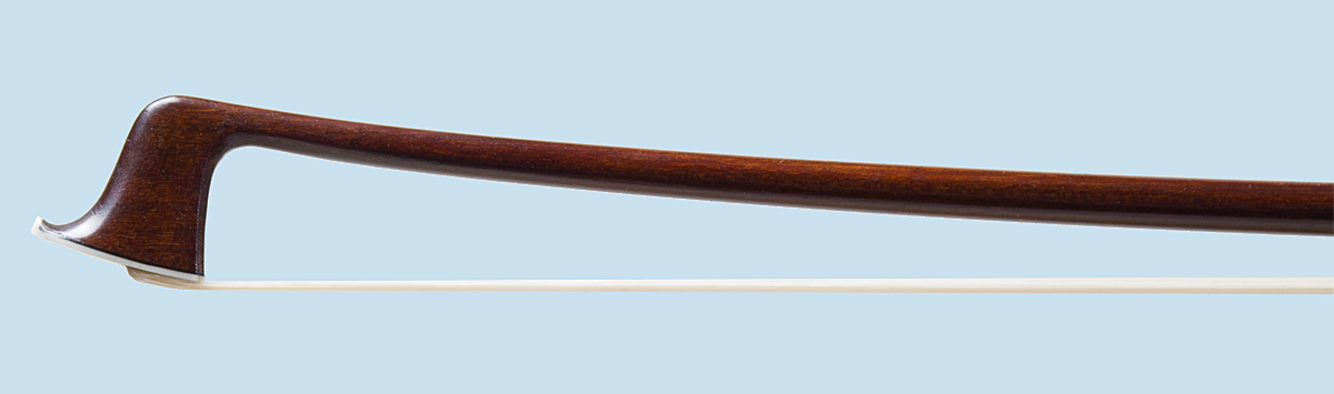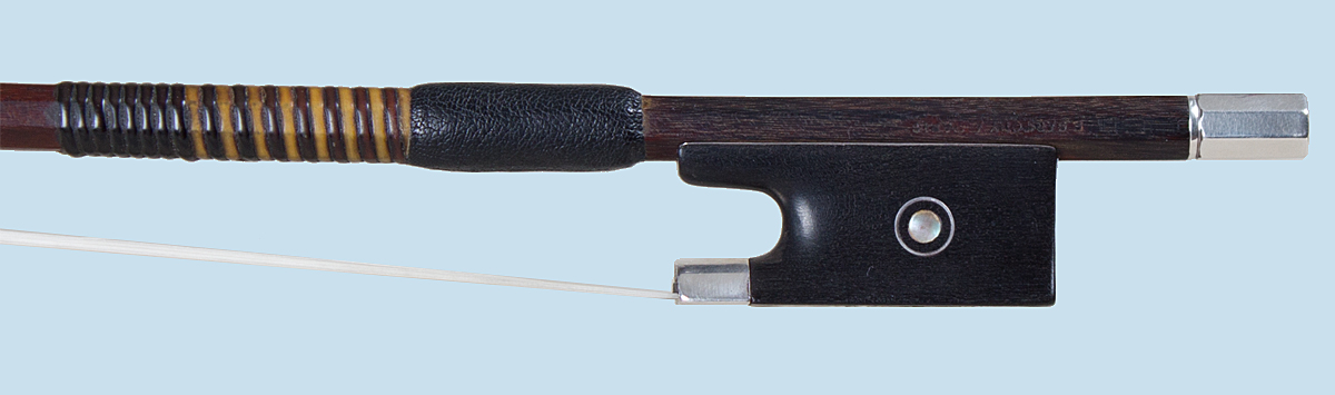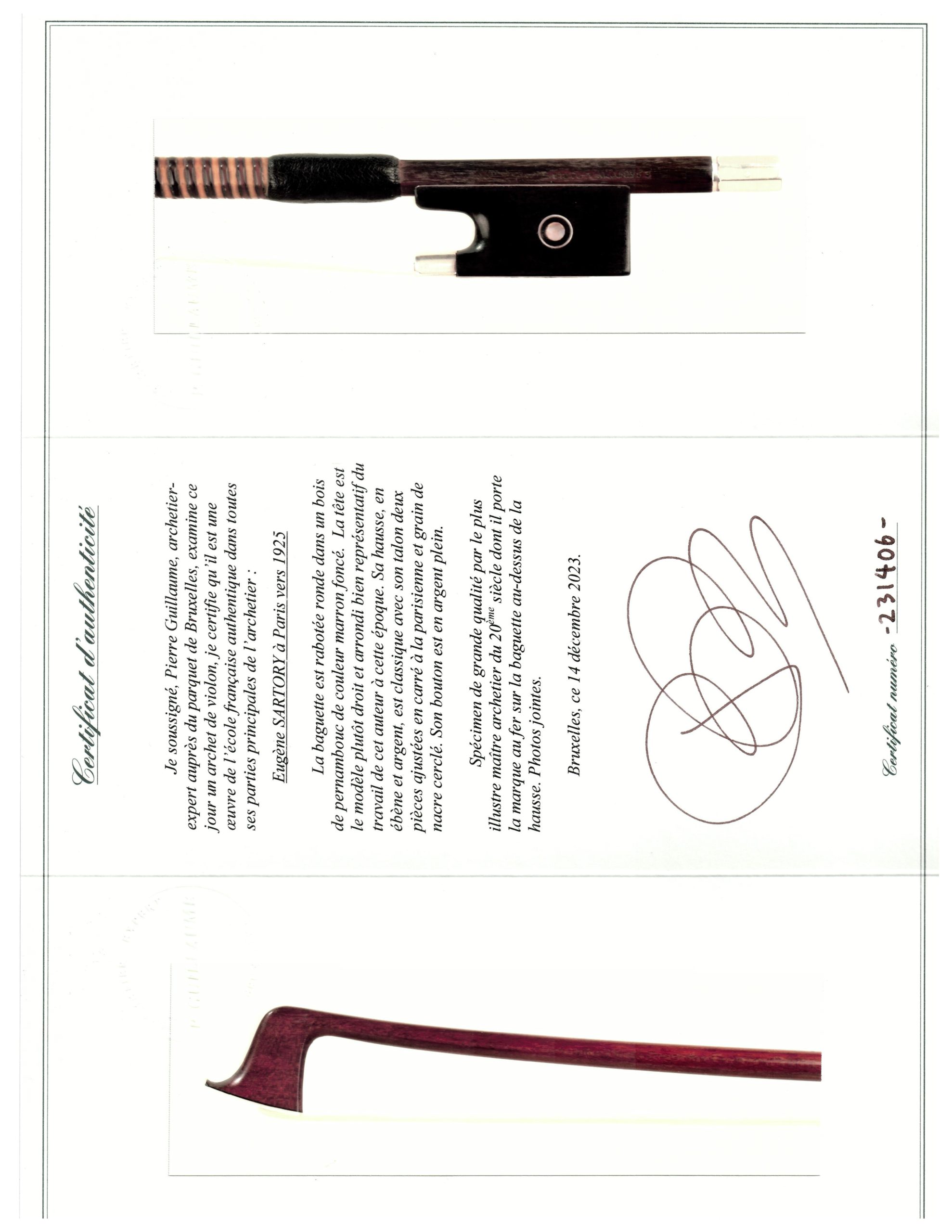 A violin bow by Eugène Sartory for sale. Sartory is probably the best known name among 20th century bow makers. His work has been found in the hands of professional players for over a hundred years. An attractive brown, round pernambuco stick, silver mounted ebony frog with Parisian-Eye inlay and a silver overlaid ebony adjuster. The weight of 63g produces a powerful playing stick which meets all the requirements of the working professional.