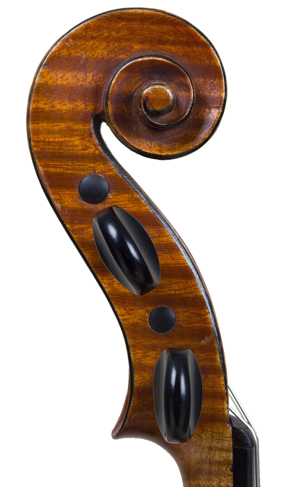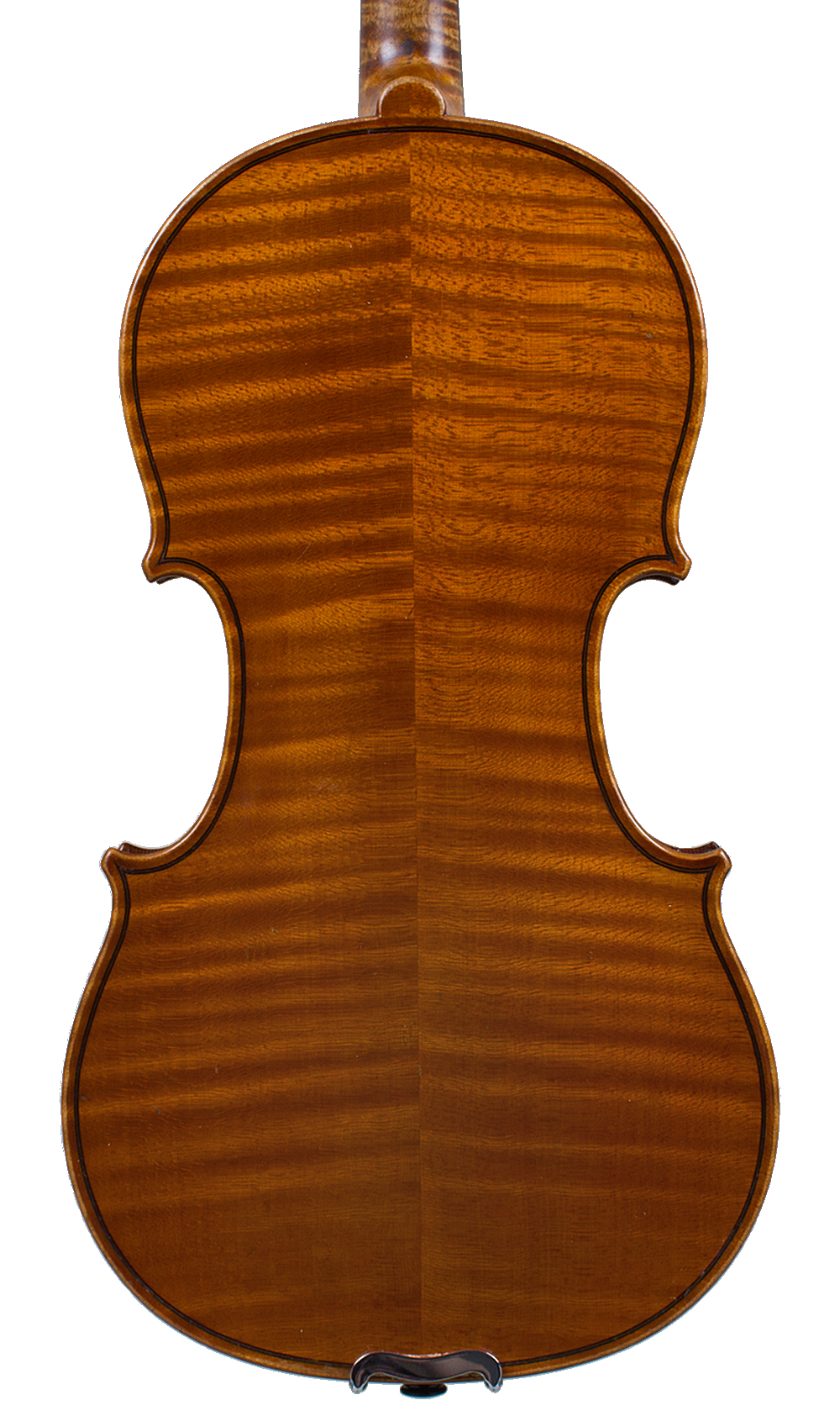 The violin back, length 361mm, is in two pieces of quarter-sawn maple with a strong curl of medium width; the ribs, scroll and neck of similar wood. The front is of fine grain spruce which broadens towards the flanks and the varnish of a red-brown colour.