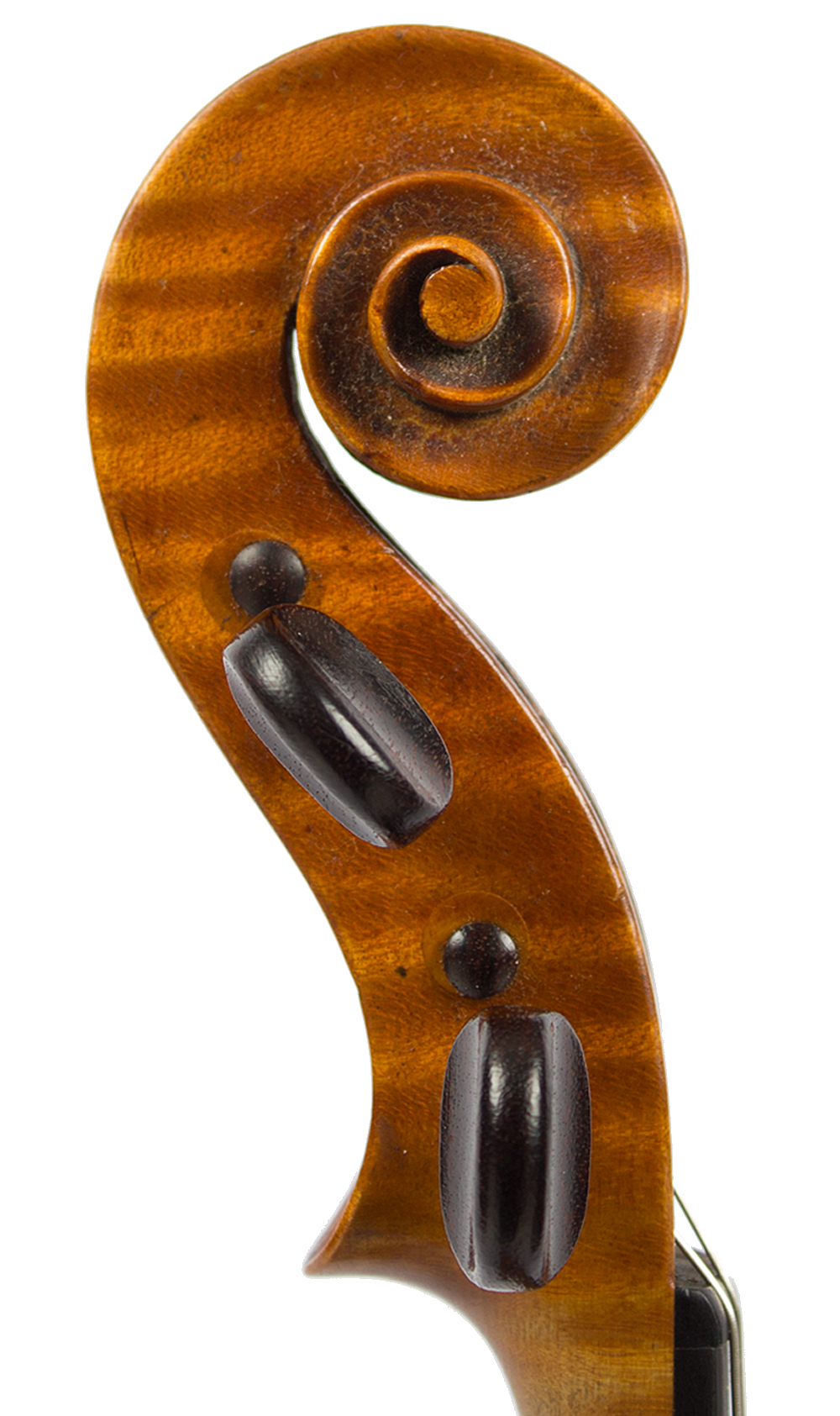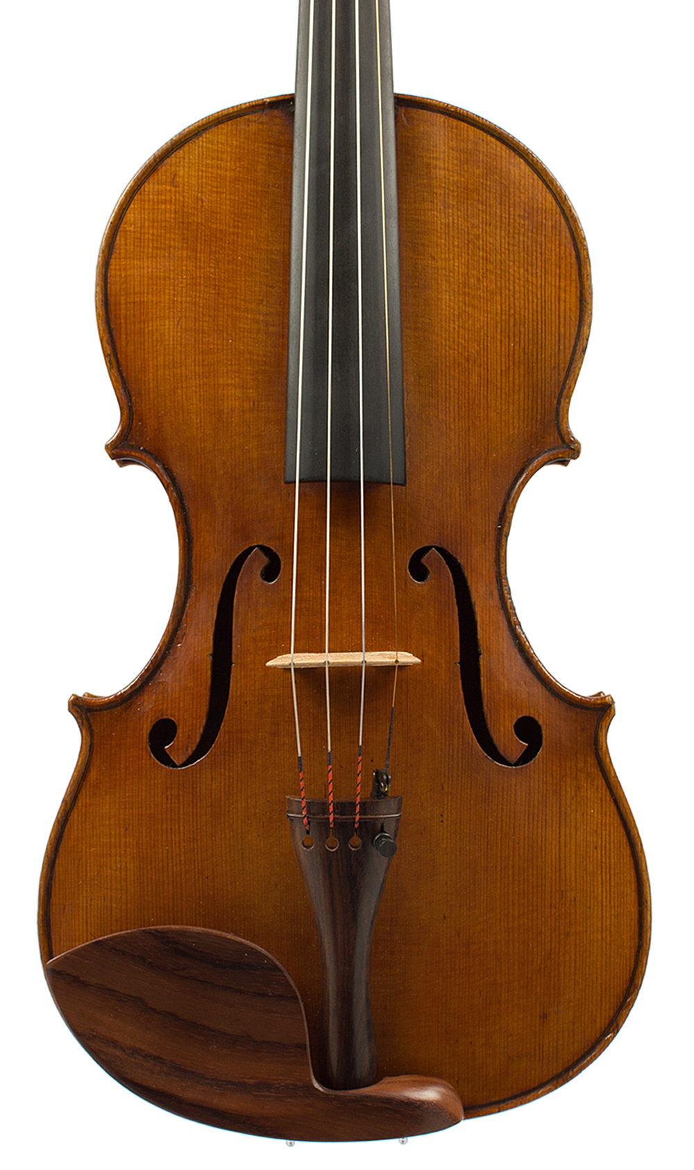 The violin back, length 356mm, is in two pieces of quarter-sawn maple with a curl of medium width; the ribs, scroll and neck of similar wood. The front is of medium grain spruce and the varnish of a golden-brown colour.