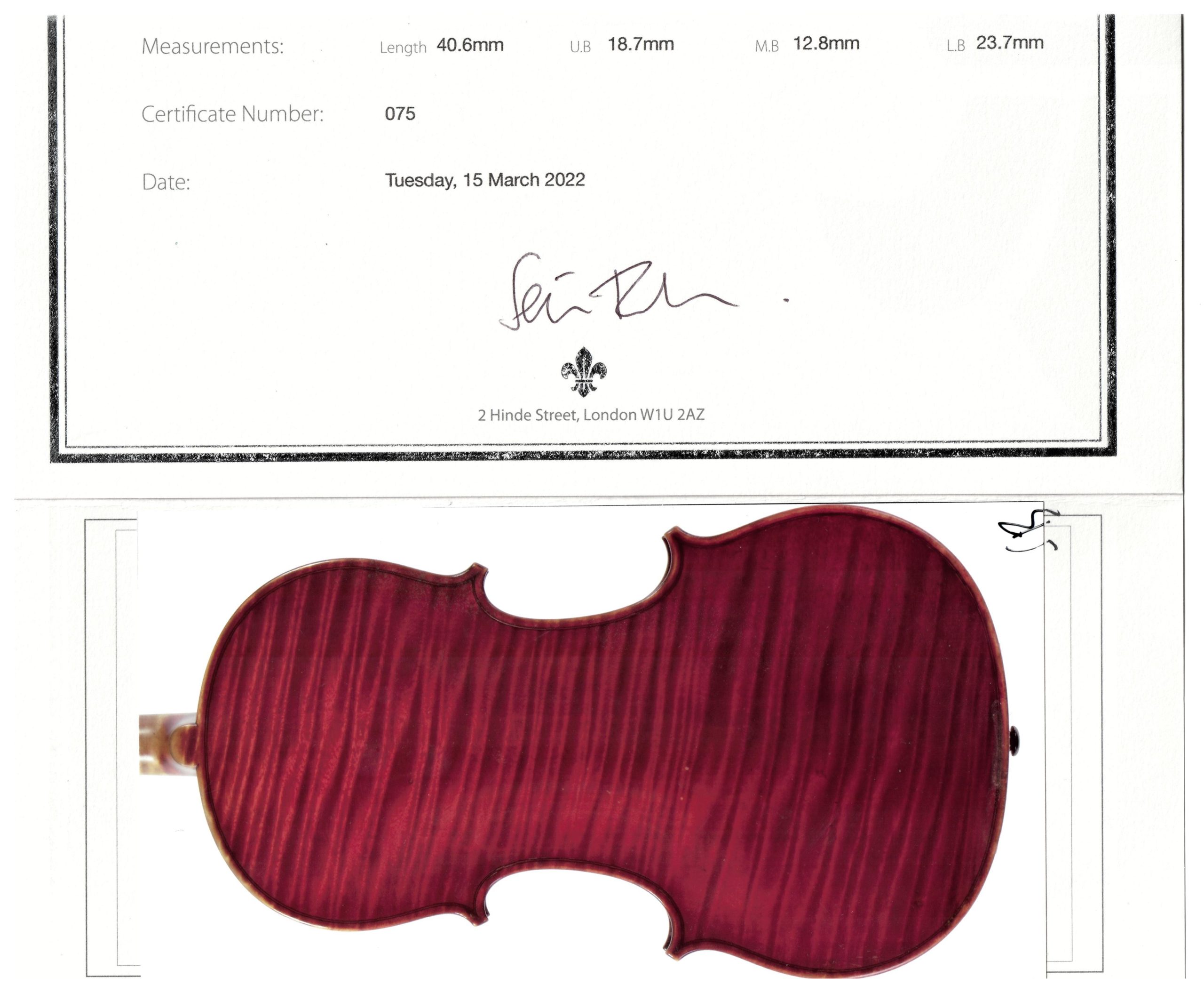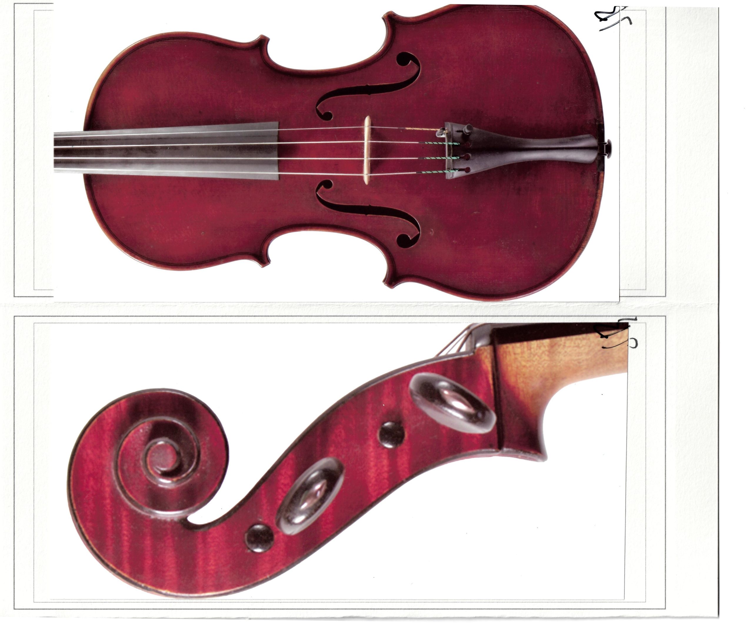 The viola back, length 410mm, is in one piece of quarter-sawn maple with a strong curl of medium width; the ribs, scroll and neck of similar wood. The front is of fine grain spruce and the varnish of a red-brown colour.