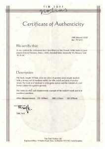 In his time working for various high quality workshops Derazey produced violins on many different models but for his own work he generally favoured that of Stradivari.