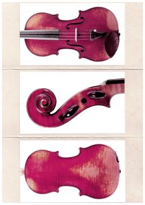 The violin back, length 358mm, is in one piece of quarter-sawn maple with a strong curl of fine-medium width; the ribs, scroll and neck of similar wood. The front is of fine-medium grain spruce and the varnish of a red-brown colour on a golden ground.