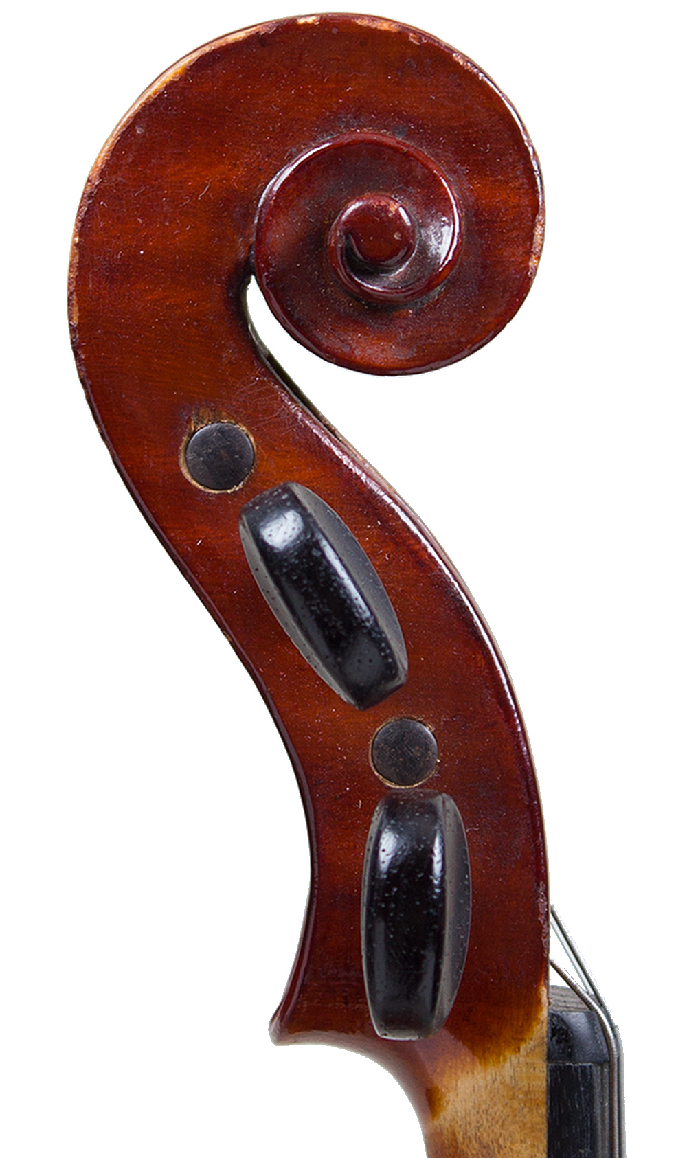 The violin back, length 359mm, is in two pieces of quarter-sawn maple with a faint curl of narrow width; the ribs, scroll and neck of similar wood. The front is of fine grain spruce which broadens towards the flanks and the varnish of a deep red-brown colour.