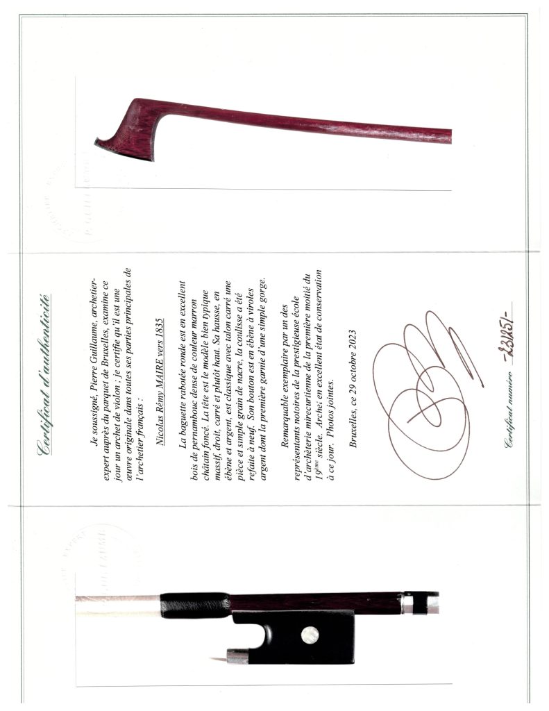 Certificate from Pierre Guillaume, Brussels: “Remarkable copy by one of the notorious representatives of the prestigious Mirecourt school of bowmaking…”