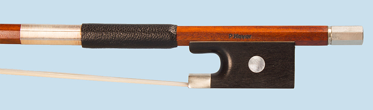 Pernambuco violin bow for sale, from the long established Hoyer workshop. This German crafted ‘P. Hoyer’ violin bow with an octagonal stick, nickel mounted ebony frog with pearl eye inlay and nickel overlaid adjuster.