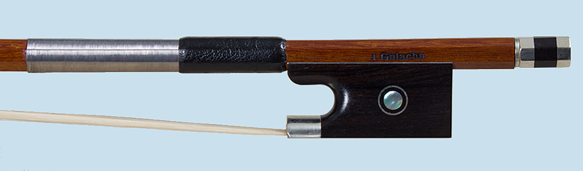 ‘J. Galacha’ violin bow with a round stick, nickel mounted ebony frog with Parisian-Eye inlay and ebony adjuster with two nickel bands.