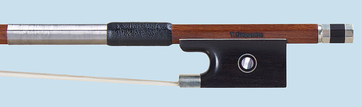 ‘T. Siqueira’ violin bow with an octagonal stick, nickel mounted ebony frog with Parisian-Eye inlay and ebony adjuster with two nickel bands.