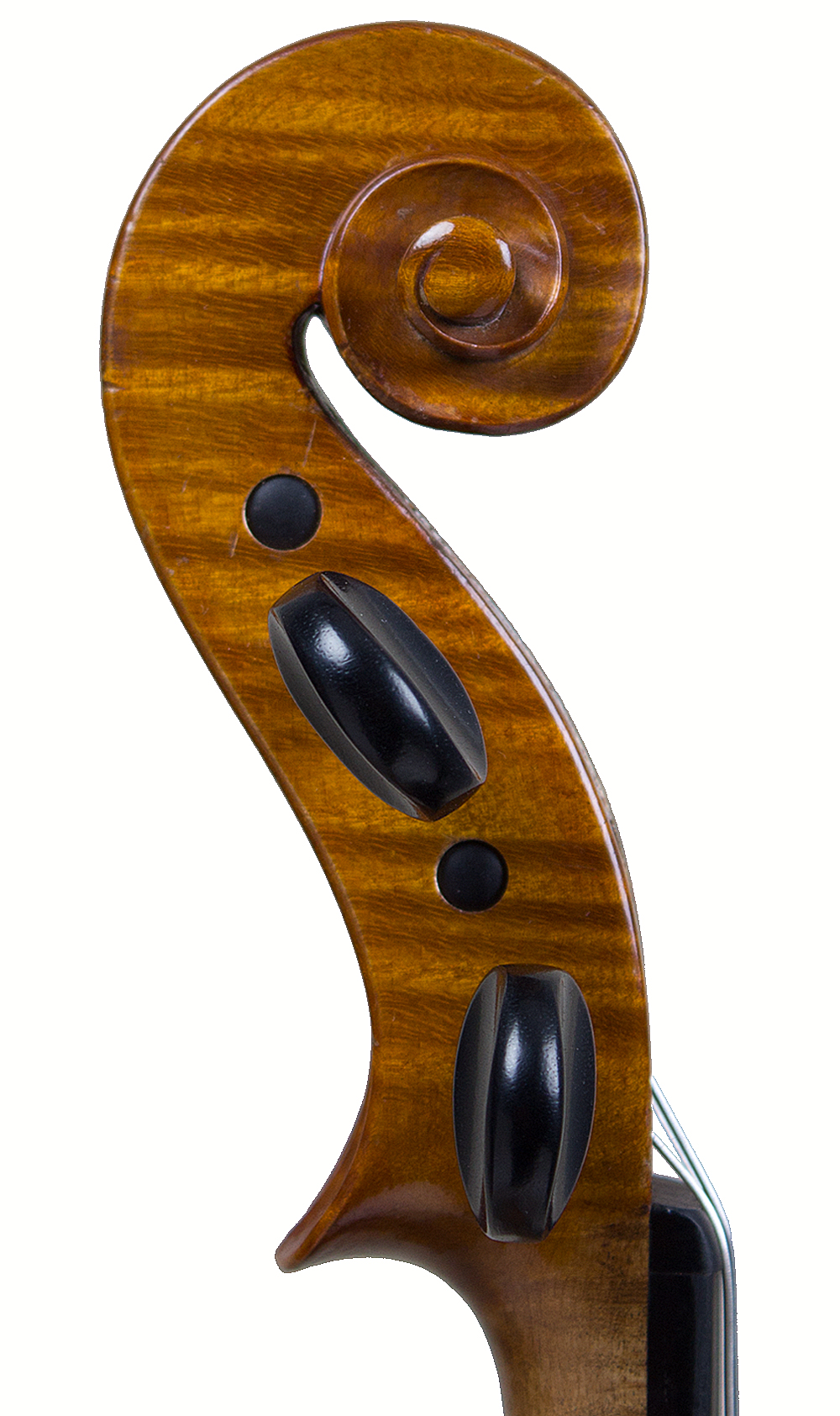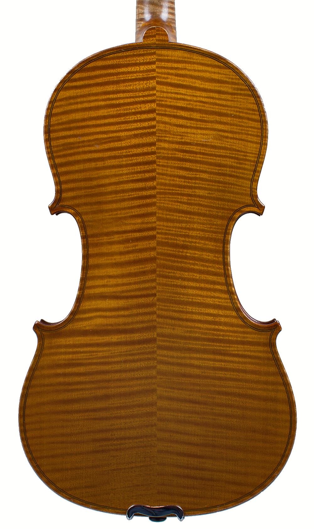 The violin back, length 358mm, is in two pieces of quarter-sawn maple with a strong curl of narrow width; the ribs, scroll and neck of similar wood. The front is of fine grain spruce and the varnish of a light golden-brown colour.